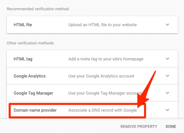 Bahsettiğimiz gibi Google Search Console'dan verilere erişmek için site sahipliğini doğrulamanız gerekir. Google Analytics izleme kimliğinizi kullanmak dışında, eklediğiniz mülk türüne bağlı olarak bunu yapmanın iki yolu vardır.